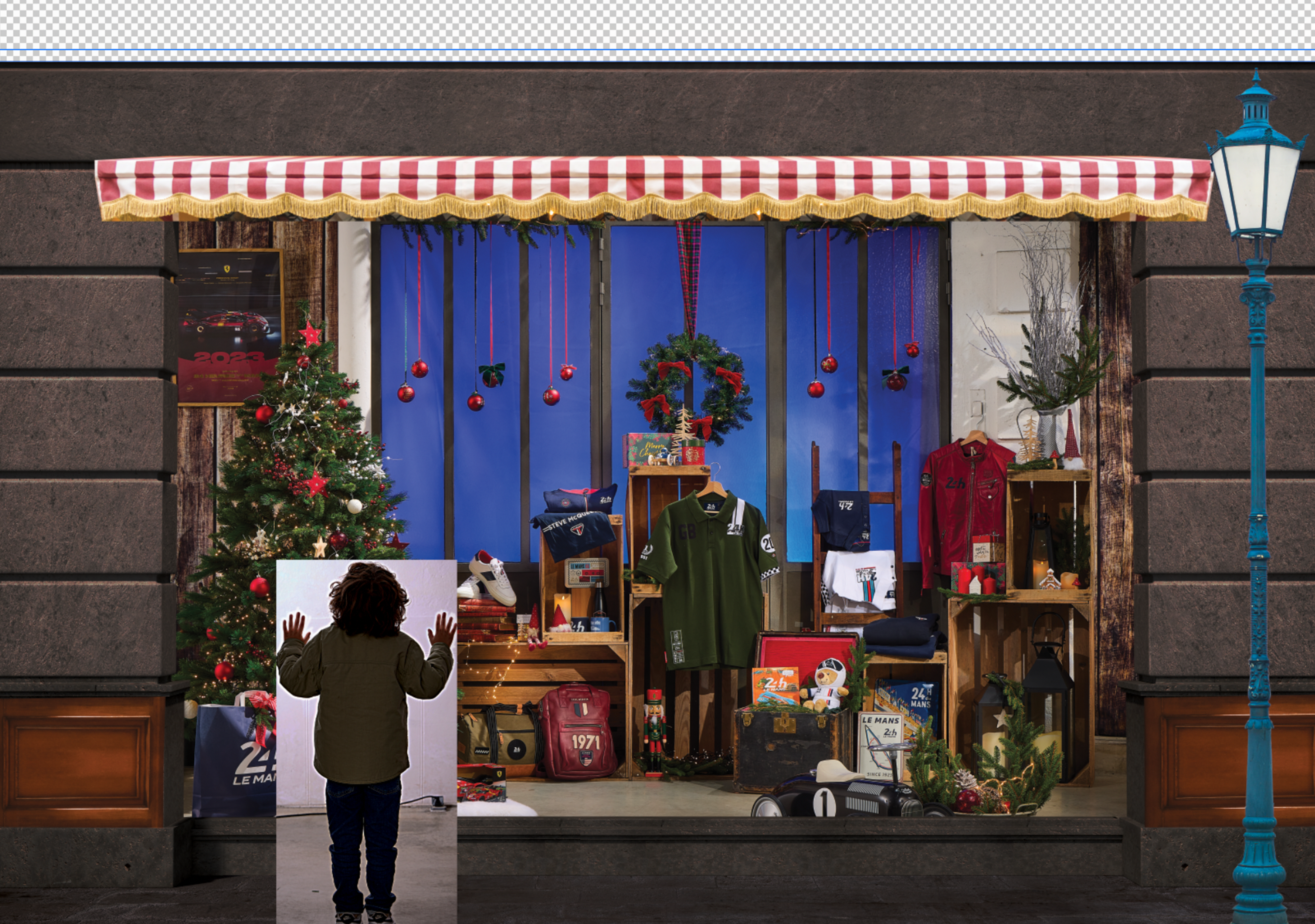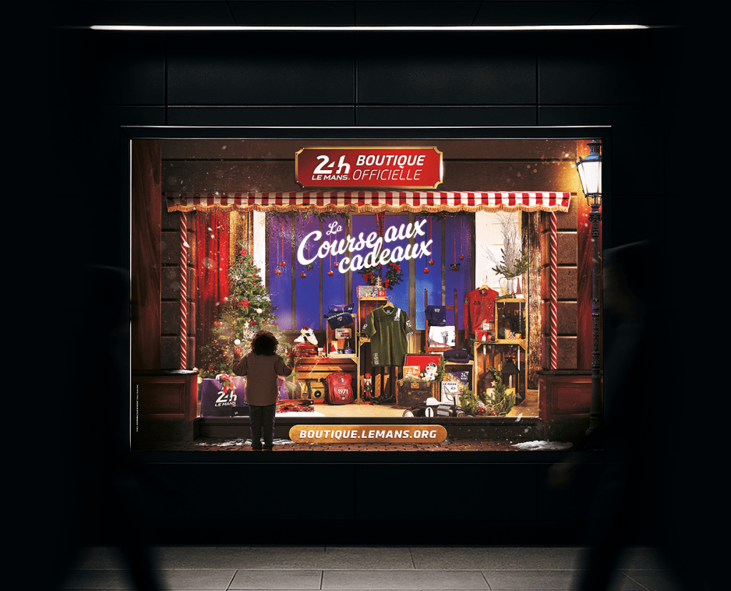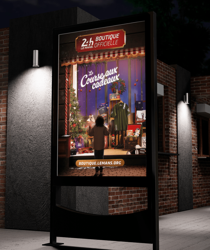 Pour cette campagne de Noël, j’ai imaginé un univers visuel inspiré de la féérie des vitrines de fin d’année, tout en conservant une identité forte et cohérente avec celle de la Boutique des 24 Heures du Mans.