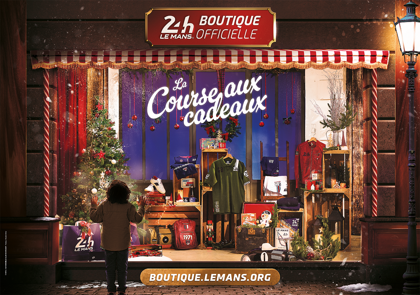 L’affiche principale s’articule autour d’un slogan évocateur : « La course aux cadeaux », un clin d’œil à l’événement mythique des 24 Heures, tout en évoquant l’effervescence des fêtes de fin d’année.