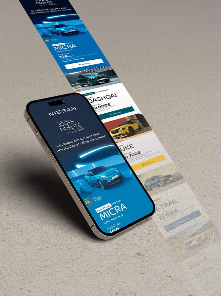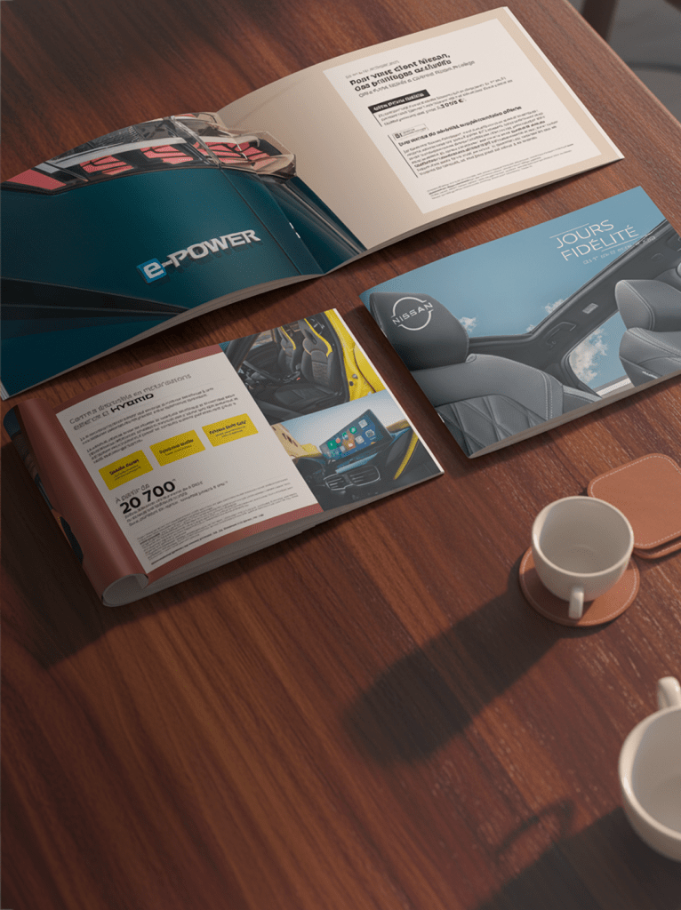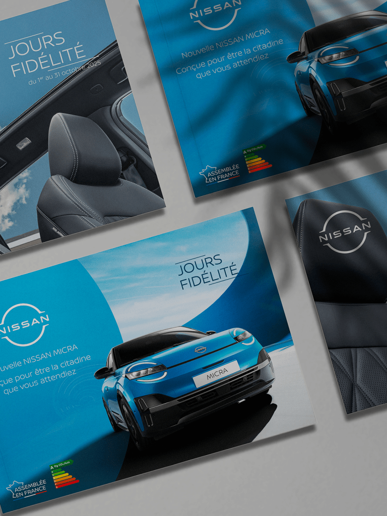 J’ai conçu le design de la campagne des Jours Fidélité Nissan au côté du Groupe Publicis. Emailing et Brochures, un travail centré sur la lisibilité, l’impact visuel, et la qualité de l’expérience utilisateur.